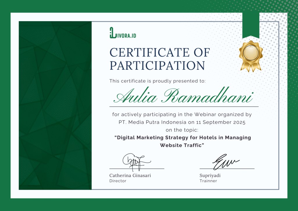 Setiap peserta yang mengikuti webinar akan mendapatkan sertifikat resmi dari Livora sebagai bukti peningkatan skill Anda. Sertifikat ini bisa digunakan untuk portofolio, LinkedIn, maupun kebutuhan profesional.